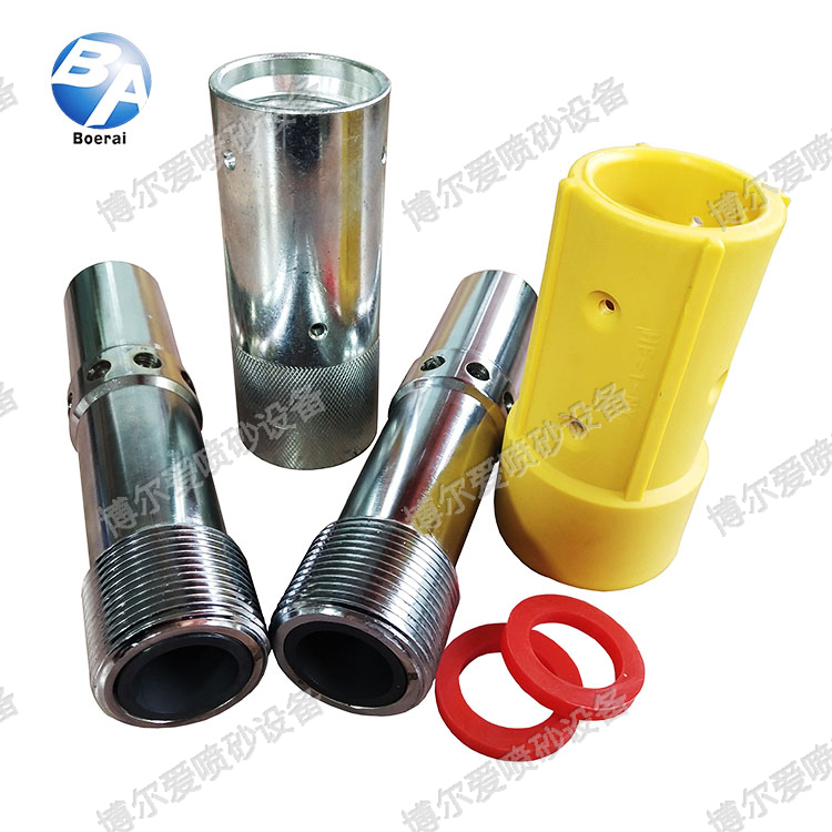 雙進(jìn)風(fēng)噴槍是噴砂機(jī)常用配件種類之一,中間外殼四周有八個(gè)孔,應(yīng)用二次進(jìn)風(fēng)原理,屬于高速型噴砂槍,是具有一個(gè)文氏的噴管,氣流在進(jìn)入高速噴砂槍頭的收縮段時(shí),氣流開(kāi)始加速直到高速;當(dāng)?shù)竭_(dá)文氏管的直段時(shí),氣流速度穩(wěn)定在音速,當(dāng)氣流到達(dá)文氏管的擴(kuò)張段時(shí)氣流繼續(xù)加速達(dá)到超音速;在文氏管的擴(kuò)張段有圓孔分布的二次補(bǔ)氣孔,因此在超音速階段,氣流急劇膨脹,噴嘴就從此孔補(bǔ)氣吸入大量的輔助空氣,將砂料進(jìn)一步加速;與普通噴砂槍頭相比,這種噴砂槍頭的噴砂速度更快,工作效率可提高30%(工作效率達(dá)到30m2/h),且反沖力較小,操作時(shí)省力;該型高速噴砂槍頭的收縮段、直段和擴(kuò)張全部由碳化硼制造,工作壽命長(zhǎng);一般一把可使用600-800小時(shí)。常見(jiàn)材質(zhì)有碳化鎢,碳化硼,碳化硅等多種材質(zhì),碳化硼雙進(jìn)風(fēng)噴砂槍硬度高、耐磨性好、抗腐蝕性強(qiáng)客戶可以根據(jù)要求選擇。
